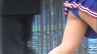 『青スコートに黄は京都美人の※※※※です。応援コールになりターンをしながら登場すると、翻ったスコートからアップになった下半身や手前のスリムなおかっぱ娘の食い込み気味のアンスコがそそっていました。後片付けになると、手前の気になっていたオレンジスコートチアの純白パンチラを収めることが出来ました。