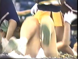 ※※チアの踊りの振り付けはハイキックが多いことで有名で、それが各大学の中でもダントツに高い人気を誇っている理由のひとつなのですが、この日はあらゆるアングルから狙って来る数多くのいやらしいレンズを目の前にして、チアも明らかに困惑していました。ほとんど脚を上げてくれません。それでも笑顔を絶やさないのはさすがです』