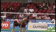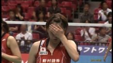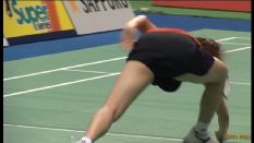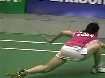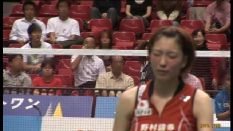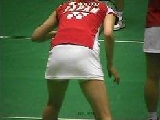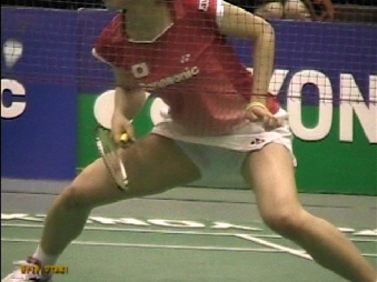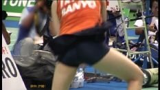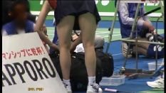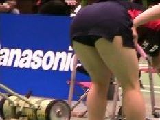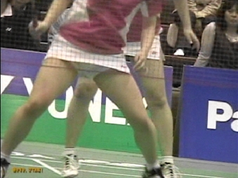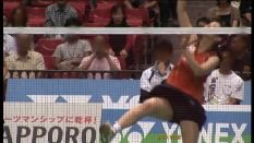 青スコートに赤柄シャツのT北電力はパンチラなど全く意に介さない集中振りで、ジャンピングスマッシュやローボレーやウンチングスタイルなど激しく大胆な動きですっかり釘付けでした。特に、落ちたシャトルを拾う時や最後に地べたに屈んで記帳する時にアップになったお尻のシーンは何とも言えません。途中一瞬ノイズが入るシーンがあります。