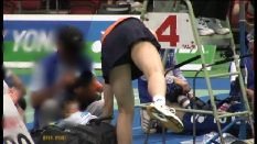 シンプルな上下純白のポニーテール娘もいて、超ミニのふわふわしたスコートからは簡単にパンツが見えていました。試合後最初は正座をしていましたが足がしびれたのかすぐ足を伸ばしたり膝を立てたりして暫らく悩ましいポーズで試合を見守っていましたが、手前の障害物がちょっと肝心の部分を隠していたので残念でした。ノイズがちらついてお見苦しい場面もあります』