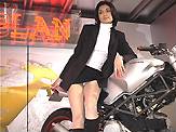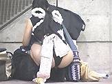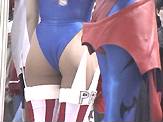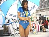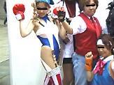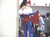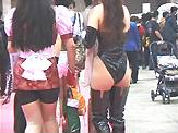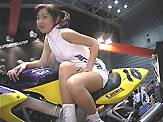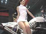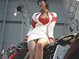 ブースでは、騒動勃発。ま、騒動、というほどでもありませんが、車の前につっ立ったキャンちゃん、ポーズを取りながら、スカートの前裾を懸命にひっばりまくっております。いっこうにやむ気配がない、ないどころか、突如慌てふためきだします。足元には、なんちゅうことじゃ、芋虫のように匍匐してきたびでお君一匹! うぅん、このおかたの根性もなかなかではありますが、しかし、▼地帯撮影とは単により下から構えればいいというもんじゃありませぬ。その証拠に、裾を完全防御して前方の芋虫君に気をとられたキャンちゃんの背後にすかさず回り、“そこ”をgetしたのは、そう、我らが“チアフェチ”さんその人。これぞ「分身の術」(ま、似たような人がいたもんであります)にして、「漁夫の利」。かの君より、“チアフェチ”さんが一枚上手(うわて)だったようですね