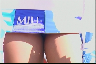 (画撮↓ の)ミニスカ・白パン細みちゃんが踊る、跳ねる(in“2004東京モーターサイクルショー”)。キックにターンを交えての(リズムに乗った)カクカクッとしたダンシングがセクシーに決まってます。セクシーに、いや、そのレベルじゃありませんね、この画角じゃ……。画撮すら、「こりゃ遠慮気味作りか」と思われるくらい、実物映像は、画面いっぱいのデカでか撮り(それも、えんえん10分以上……)(係員も唖然の、ぶつかる寸前tic撮り、それが「えんえん」なのです)。
