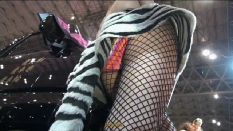 『最後のブースは美脚モデルがズラリで、しかも大好きなエロエロ網タイツ!♪ これを撮れただけでも東京まで来た甲斐があったというものです。チラチラデルタ地帯が見えるのが非常にエロいです(顔をうずめてみたい、と思うのは私だけではないハズ・・)。