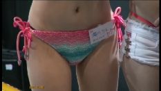カラーホットパンツちゃんたち……オナカでコンニチハさせた下履きの白Tバックを、下端でやむなくチラさせてます。まぁ、完璧に隠せというほうが無理な話。というわけで、5人ちゃん全員沈没。(38分)