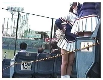 短時間作ですが、ハイライトは、ずばり、(チアちゃんたち)総出のゴミ回収となった、帰り支度シーン。落ちてるのを探して拾うわけですから、ま、どうなるかはご想像にお任せするとして……。観客席のチアちゃんたちの一括撮り(byうんこ座り)くらいは朝飯前(?)の序の口、前屈みを真後ろの“ど下”からすくい撮る「あわわわ