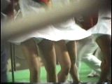 『青スコートに黄は京都美人の※※※※です。応援コールになりターンをしながら登場すると、翻ったスコートからアップになった下半身や手前のスリムなおかっぱ娘の食い込み気味のアンスコがそそっていました。後片付けになると、手前の気になっていたオレンジスコートチアの純白パンチラを収めることが出来ました。