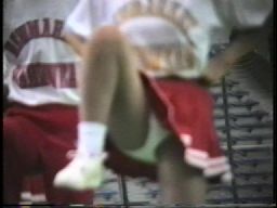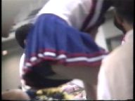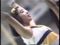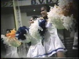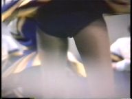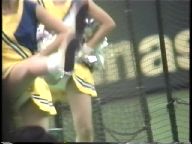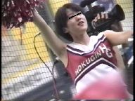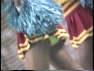 次は、真っ赤なスコート、ノースリーブに白ソックスの**※※です。今は廃部になって久しいですが、この頃はまだチアたちの生きいきとした演技を楽しめました。コスチュームが変わってからも、振り付けのほうは余り変わらず大胆で派手な所は残したままでした。この他に、白スコートにピンクTシャツのチアも登場し真っ赤なパンツをちらつかせて踊っていましたが、手前のポニーテールの娘がよく見るとはみパンしていました。また、お嬢様系チアが多いのもこのチームの特徴でしたが、上品な顔に似合わず下半身の動きが派手なので、思わず食い入るように見入っていました。