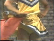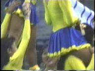 次は※※※※です。お馴染みの臙脂のジャンパースカートをはじめとするチアーたちがいっせいにステージに勢揃いしてお披露めですが、ポジションが決まらずあちこち動くたびにパンチラが……。ステージでは元気なチアーが思い切りの良いパンチラを見せています。臙脂のチアーは二人一組で背中合わせに下半身を持ち上げるとスコートが揺れて下半身が丸見えになるシーンもあり、大興奮でした』