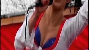 いずれも、雪の舞う野外ステージでのへそ出し、ハミ乳ルック。