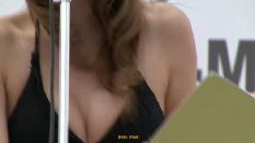 受賞後の撮影タイムでは、ミニの制服を着たミスが賞品を下に置く時にしゃがむと、デルタ地帯にはっとさせられる場面もありました。受賞した3人のミスたちが椅子に座ってボウリングウェアのインタビューを受けた時に、「ちょっときついです。スカートが短いので、ちょっと足が太いから似合わないかなと……」と、執拗なカメコの股間攻撃にミニの裾を押さえながらの苦しい回答振りのミスもいました』