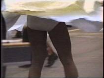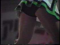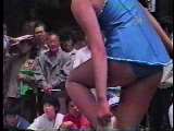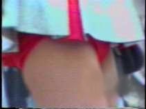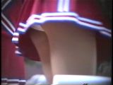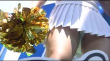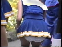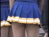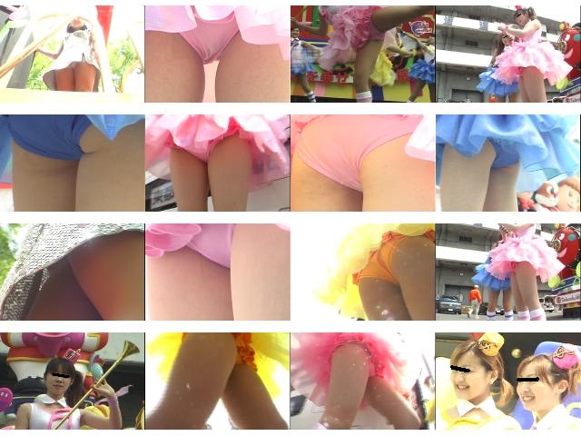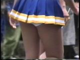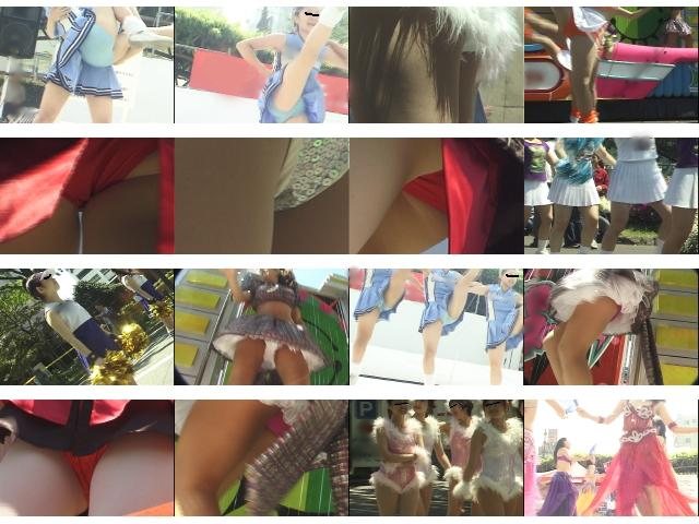 『次は、別の場所で秋に行なわれたパレードです。これも、バトンやフロートなど盛りだくさんの企画でしたが、なかでも圧巻なのは、フロートチアでした。待機中、フロートの上で、スコートを気にして、最初はおとなしくしていましたが、リハーサルが始まると、真っ赤なミニのコスチュームを翻しながら、踊りまくっていました。なかでも、おかっぱの娘は乗りが良く、下のカメコをまるで挑発するかのように、真正面でターンの連続をしてみせ、これでもかというほどパンチラを披露してくれました』