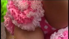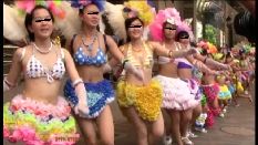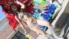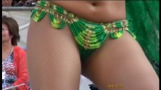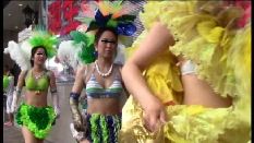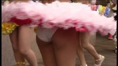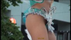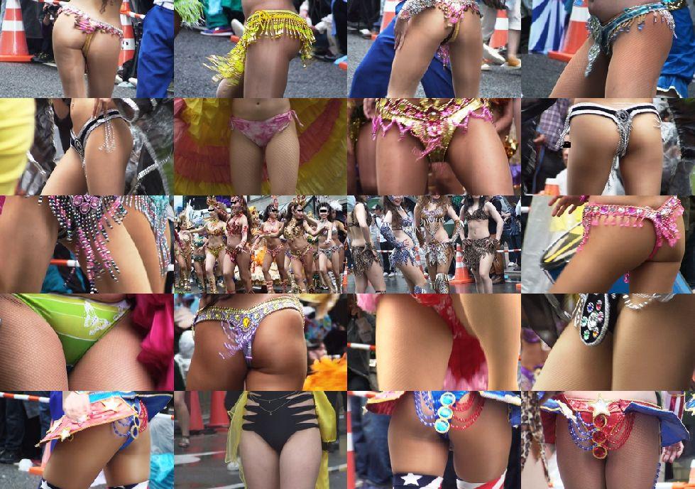 尻丸出しのお姉さんたちが目の前で悩ましい肢体をカメコたちに見せつけていました。レオタードもありましたが、ほとんど裸同然の衣装中心の中にあって、かえって燃えてきたりしました。沢山の白い羽根を背中にまとった紐パン衣装の若いお姉さんたちの周りには、カメコたちが集っていました。青のすだれのお尻美人がしゃがみ込んで靴を直しているのを見ると、すかさずカメラを回し大きなお尻がアップにされていました。白のふさふさの付いたパンツの衣装のお姉さんたちは露出はやや少な目ながら水着っぽくて良かったです。お尻の日焼け跡が眩しいお澄まし顔の黄色の紐パン娘がフロートに上っていく様を思わずカメラで追っていると、アップにされた股間がとても際どくいやらしかったです。歩道を見ればここでもダンサーたちが待機していて、間近でお尻を堪能出来、思わぬ拾い物に大感動でした。