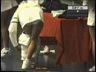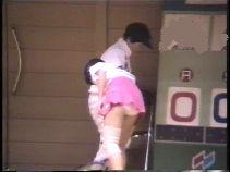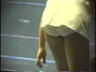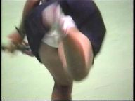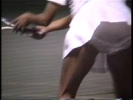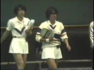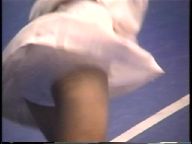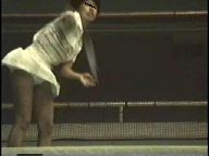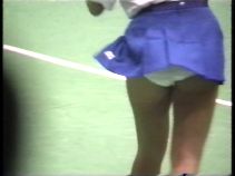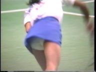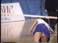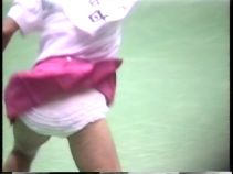 『俯瞰図になりましたが、手前のおかっぱ娘のパンチラはよく見えました。サーブやインパクトの瞬間にギャザーのスコートがふわりと捲れると純白のフリル付きアンスコが見事に顔を出していました。手前が変わっても、対戦の長身のマッシュルームカットをバンダナで締めた選手も同じようにパンチラを披露していましたが、よく見ると引退して間もない当時の初々しい浅越しNぶ選手でした。お尻に手を突っ込んでアンスコを直したりお尻から球を取り出す動作などセクシーでよかったです。