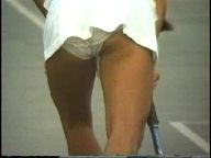 コートがかわって※※※****の青スコートの、日焼けしたボーイッシュ娘も大柄なわりに足首がきゅっと締まっていて、小麦色の腿からはみ出る純白パンチラが眩しく、よく動き回るお尻に釘付けでした。