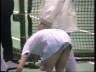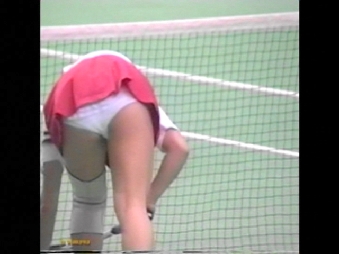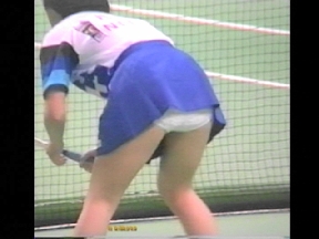 『真っ赤なスコートが眩しいT芝**は冒頭からウォーミングアップの前屈で予想外のパンチラを披露してくれ、前衛の凛々しい顔立ちをしたおかっぱ選手の長い脚からこぼれる鮮やかな純白パンチラや、対戦のピンクスコートのH島女子商業校もとても刺激的です。ピンクスコートの神戸M蔭女子大の前衛選手の、パンチラを物ともしない恐ろしく低姿勢の構えにも注目です。タカギセイコーの上下真っ青のウェアから見えるパンチラも良かったです』